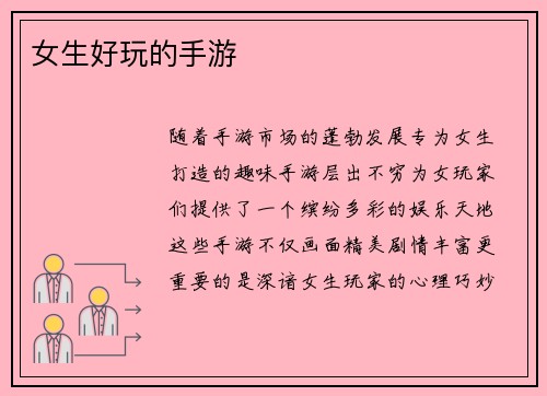 随着手游市场的蓬勃发展,专为女生打造的趣味手游层出不穷,为女玩家们提供了一个缤纷多彩的娱乐天地。这些手游不仅画面精美、剧情丰富,更重要的是深谙女生玩家的心理,巧妙融合了社交、换装、养成等元素,带给玩家无与伦比的游戏体验。